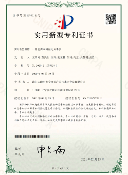 近日,沈陽達(dá)能電安全高新產(chǎn)業(yè)技術(shù)研究院(以下簡稱達(dá)能研究院)榮獲由國家知識產(chǎn)權(quán)局頒發(fā)的實用新型專利證書《一種便攜式測溫電力手套》及《一種輸變電設(shè)備多場耦合發(fā)生裝置》。達(dá)能研究院積極踐行知識產(chǎn)權(quán)戰(zhàn)略,聚焦行業(yè)前沿技術(shù),深入開展產(chǎn)學(xué)研互動。《一種便攜式測溫電力手套》聚焦測溫領(lǐng)域,貼合市場需求,便攜易操作,耐久性強(qiáng)。《一種輸變電設(shè)備多場耦合發(fā)生裝置》聚焦輸變配電設(shè)備安全管理,以前沿技術(shù)為輸變電設(shè)備提供安全保障。