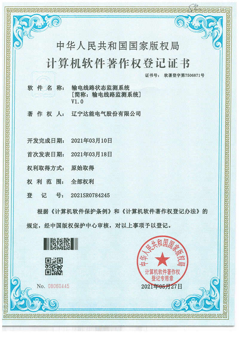 近日,達能電氣集團榮獲由國家版權(quán)局頒發(fā)的《輸電線路狀態(tài)監(jiān)測系統(tǒng)》軟件著作權(quán),這是公司不斷踐行科技發(fā)展戰(zhàn)略及知識產(chǎn)權(quán)戰(zhàn)略的有力成果。《輸電線路狀態(tài)監(jiān)測系統(tǒng)》(簡稱輸電線路監(jiān)測系統(tǒng)V1.0)是公司科研團隊圍繞公司核心業(yè)務(wù)研發(fā)升級的最新系統(tǒng),緊跟行業(yè)前沿科技,提升在線監(jiān)測水平,推進輸電新路安全升級,助力公司不斷建立核心產(chǎn)品優(yōu)勢。