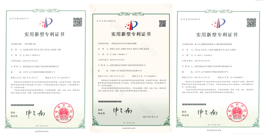 沈陽達能電安全高新產業(yè)技術研究院有限公司(以下簡稱研究院),是達能電氣集團旗下專注于電力安全產業(yè)技術研究的研發(fā)機構。2021年1月份達能研究院累計榮獲實用新型專利證書:聲屏障類;一種穩(wěn)定型分布式光纖振動傳感器;基于電力隧道巡檢機器人的不斷電換電池的裝置等。達能研究院積極推進行業(yè)技術革新迭代,加速科技成果向生產力轉化?!兑环N穩(wěn)定型分布式光纖振動傳感器》聚焦分布式光纖測溫系統(tǒng)實際應用情況,可有效提升傳感器精度和穩(wěn)定性?!痘陔娏λ淼姥矙z機器人的不斷電換電池的裝置》針對用戶換電池影響隧道監(jiān)測的需求痛點,有效解決問題,提升效率,降低運行風險。達能研究院深度發(fā)掘電力需求側特點,剖析用戶案例,開展技術研究,以實際應用為出發(fā)點,攻克技術難關,為用戶創(chuàng)造價值,助力電力安全關鍵技術升級。