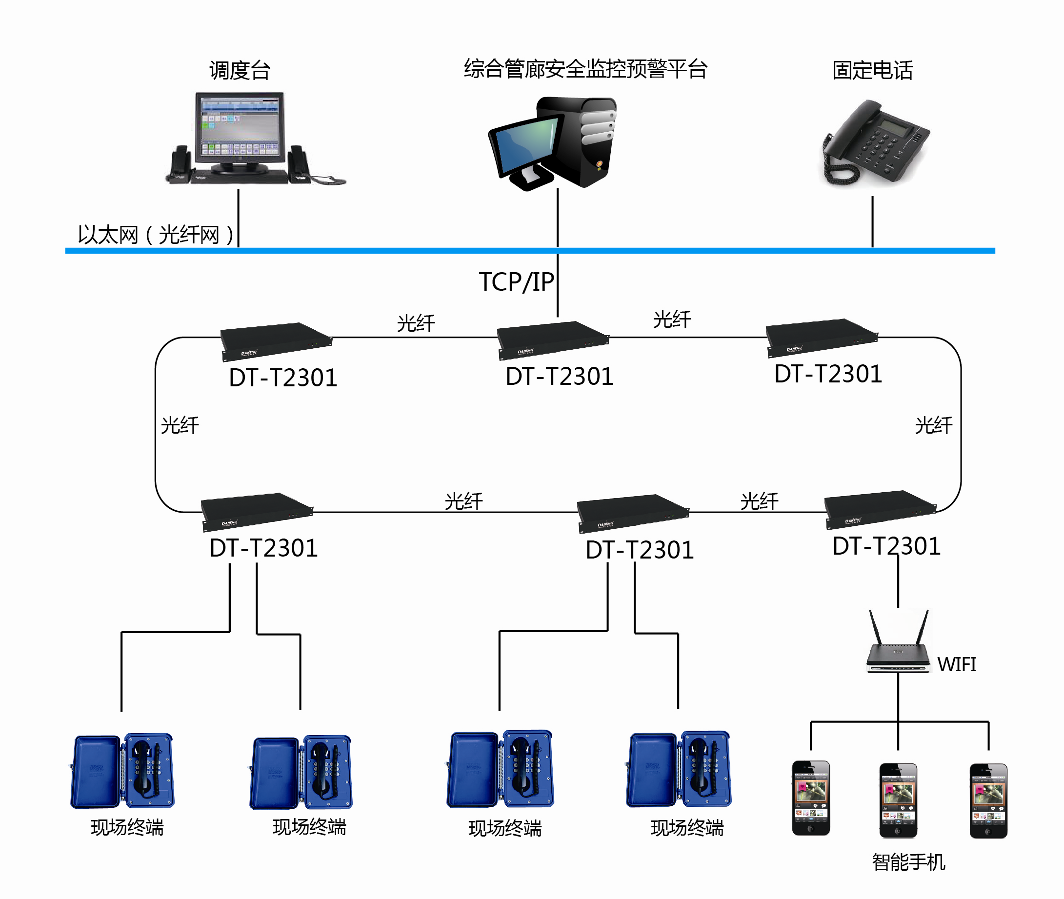要預(yù)防和避免綜合管廊內(nèi)的突發(fā)事件,或在突發(fā)事件爆發(fā)后能夠以最快最有效的手段進(jìn)行指揮和搶險(xiǎn)救援,盡可能把損失降到最低,應(yīng)急通信系統(tǒng)必不可少。采用光纖單獨(dú)成網(wǎng),有線電話與監(jiān)控中心連通,并在管廊內(nèi)設(shè)置無線信號覆蓋,保證通信的暢通 。