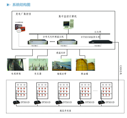系統(tǒng)通過CAN總線(可選配為RS-485)連接多臺DT-501D,完成溫度、報(bào)警、故障等數(shù)據(jù)的采集處理;通過以太網(wǎng)接口送入計(jì)算機(jī)管理系統(tǒng),支持與變電站綜合管理系統(tǒng)、MIS、SCADA、DCS等管理系統(tǒng)相連接;DT-501M可通過繼電器端口與消防火災(zāi)報(bào)警系統(tǒng)相連,當(dāng)有火災(zāi)發(fā)生時(shí),發(fā)出聲光報(bào)警,并進(jìn)行滅火裝置聯(lián)動.
