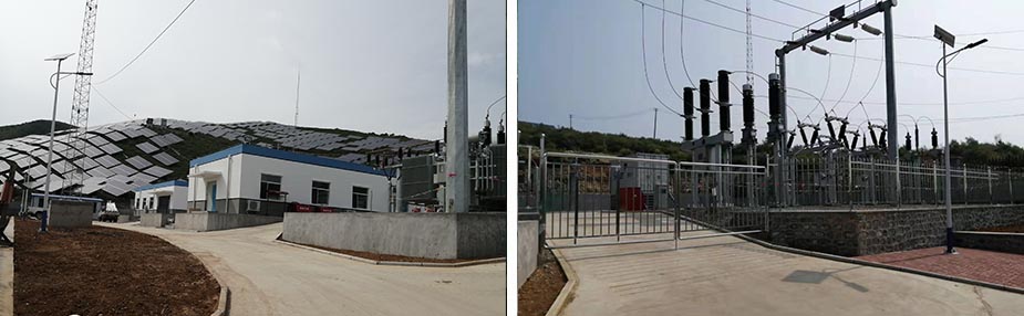 本項目采用分塊發(fā)電、集中并網(wǎng)方案,整個發(fā)電系統(tǒng)由16個約1.25MWp光伏發(fā)電子系統(tǒng)組成,每個1.25MWp電池子方陣采用2臺630kW逆變器和1臺1250KVA箱式變壓器。每方陣由太陽能電池組件串并聯(lián)而成,太陽能電池陣列輸入光伏方陣初級防雷匯流箱、直流配電柜后,通過逆變器逆變,箱式變壓器升壓后接入升壓站,經(jīng)過主變進(jìn)行二次升壓66KV后送出T接66KV團(tuán)農(nóng)線,送至220KV團(tuán)山子變系統(tǒng)。